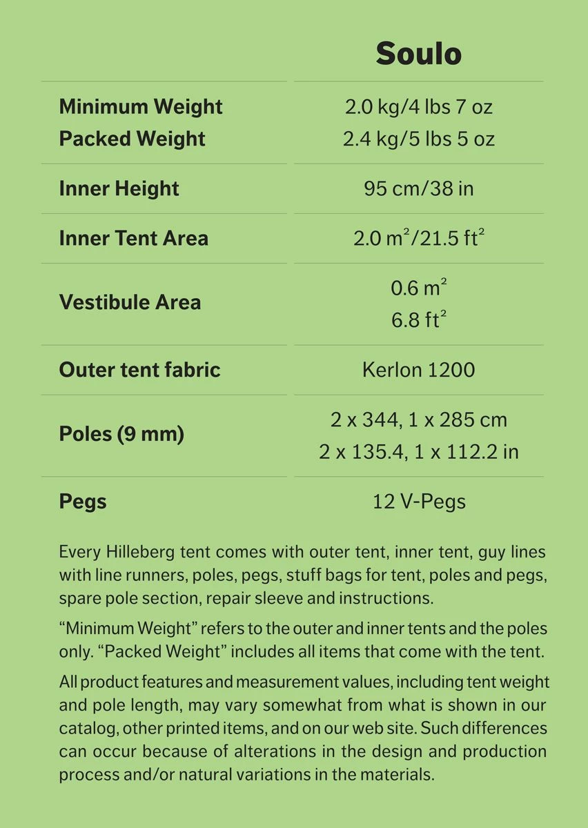 Since the Soulo’s Free Standing construction allows it to be pitched almost anywhere, and since it is remarkably light and tremendously strong, it is ideal for almost any adventure. During its development, nearly every tester found it perfect for whatever trip it was used on. Mountaineers, both recreational and professional, will take to this lightweight one person tent’s strength and low weight, as will backcountry hunters and winter campers. Bicycle, motorcycle and paddle tourers will choose it for its free standing simplicity and compact packed size. Backpackers in all seasons, long distance trekkers, and weekend hikers alike will be drawn to its light weight and integrated vestibule, and ski tourers and ski mountaineers will appreciate its snow load handling. Tall users will love the Hilleberg Soulo 1 person tent’s length, and all will appreciate its remarkable overall roominess.