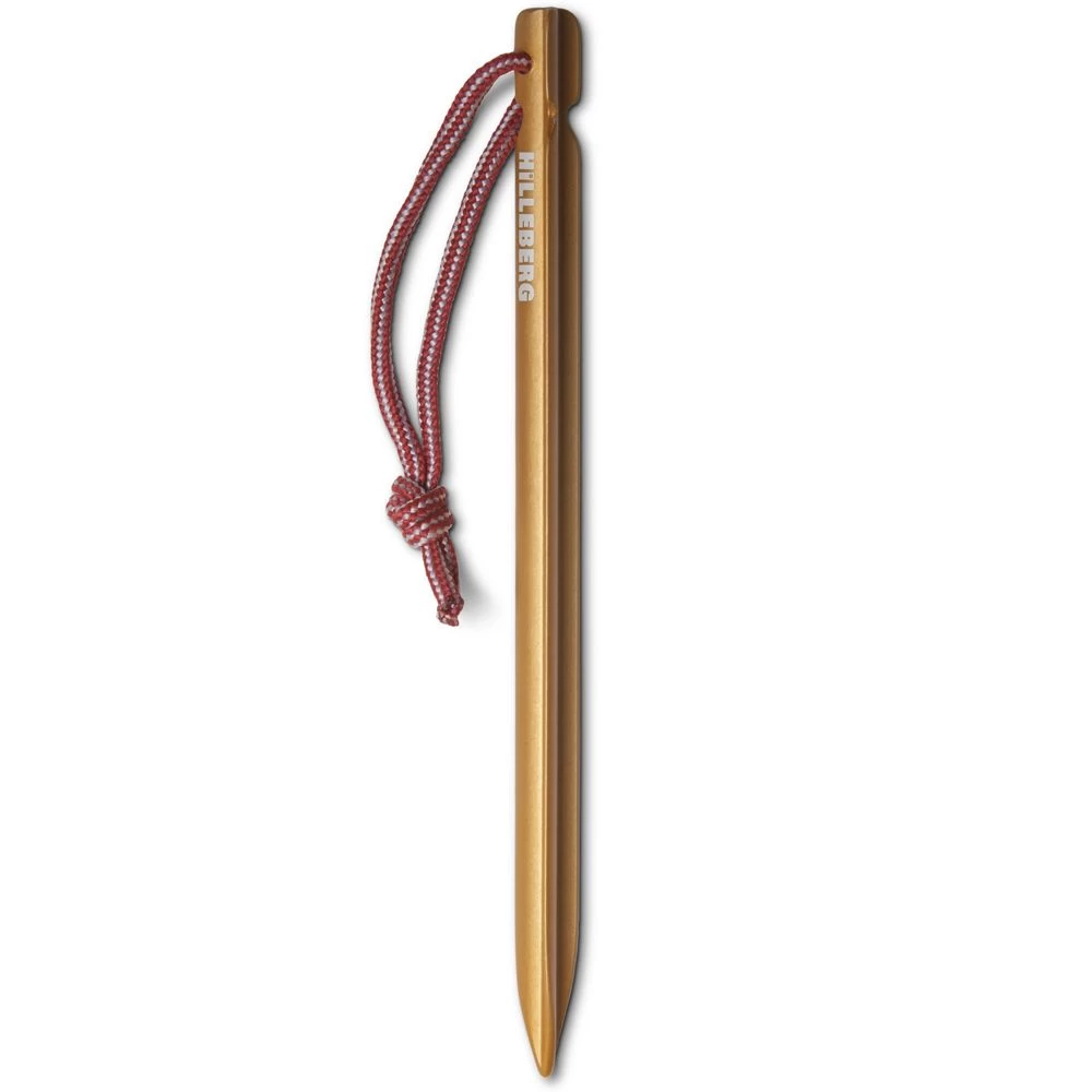 Hilleberg’s lightest peg, the new, hardened aluminum Y-Peg UL has a “Y” cross-section similar to our Y-Peg, but in a smaller (and lighter) package. While not quite as robust as the larger Y-Peg, it offers a great balance of hard ground penetration and soft ground holding power. Its gold anodizing makes it highly visible, and the attached string loop makes it easier to pull it from the ground.