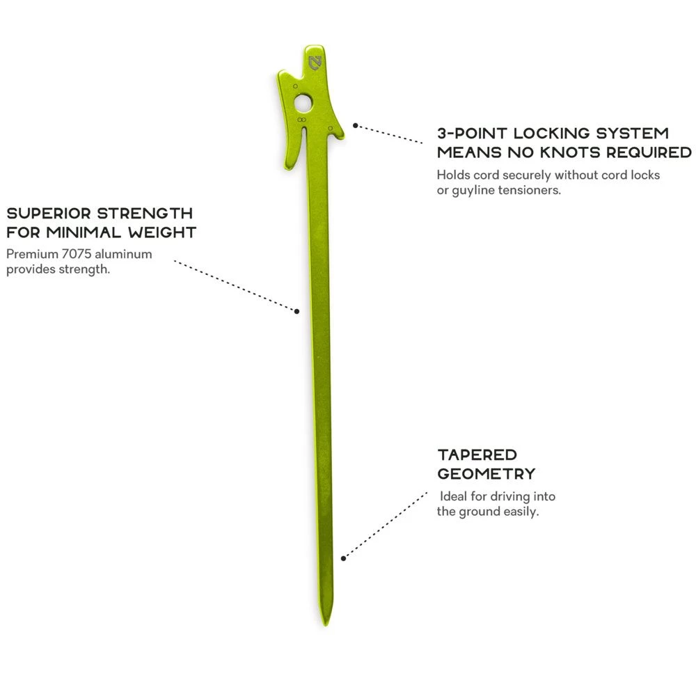 Ultralight stakes have never been so smart. Airpin’s three-point locking system holds cord tight and eliminates the need for knots, cord locks or guyout tensioners. The tapered geometry is ideal for driving into the ground and the 7075 aluminum offers superior strength for its minimal weight.