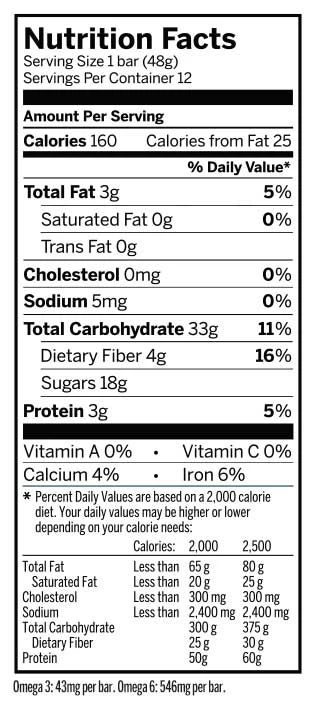 - Ingredients: Organic data paste, organic brown rice syrup, organic cashews, gluten-free oats, gluten-free oat bran, apple juice infused cranberries, chia seeds, raspberry puree, vegetable glycerin, sunflower oil, natural raspberry flavor, citric acid, rosemary extract, natural tocopherols, ascorbic acid, arabic gum